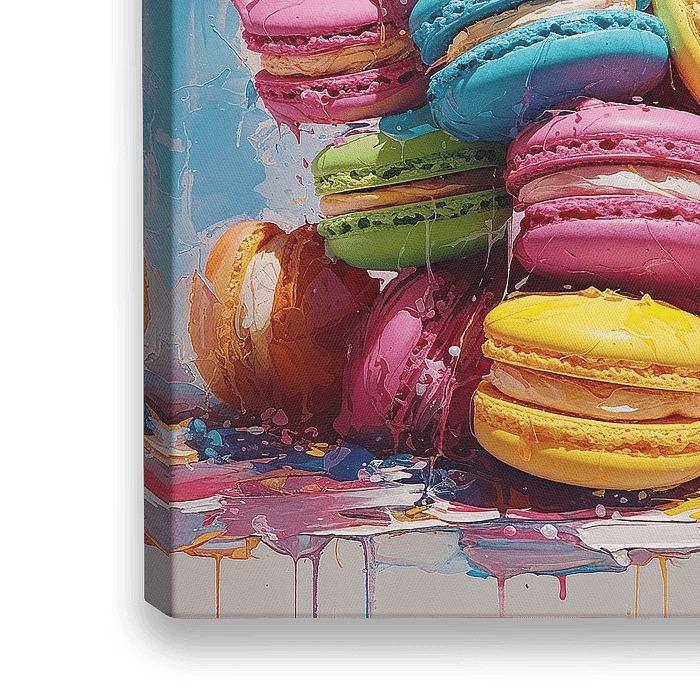Een stapel kleurrijke macarons, elk met hun eigen karakter en smaak, staat centraal in dit levendige werk. De illustratieve stijl geeft ze een bijna tastbare textuur — alsof je er eentje kunt pakken en proeven. Van zachte pasteltinten tot diepe, rijke kleuren: de compositie is een feest voor het oog, zonder druk te worden.