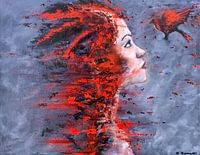 « De liefde is een vogel, die zingt in het hart van de vrouwen « Een schilderij geïnspireerd door deze spreuk met heel veel emotie. De kleuren en de thema geven kracht en zachtheid tegelijk .