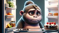 Gorilladame nr. 40 staat voor de open koelkast, heen en weer geslingerd tussen nachtelijke trek in snacks en dieetdoelen. Het koelkastlicht werpt een fel licht op haar peinzende gezicht en haar smakelijke verleidingen. Een taart, sandwiches en verse aardbeien roepen verleidelijk, terwijl haar blik zowel verlangen als bezorgdheid verraadt. Het is een alledaags conflict, op humoristische wijze gerealiseerd, dat de innerlijke strijd over zelfbeheersing en het plezier van verwennerij verbeeldt.