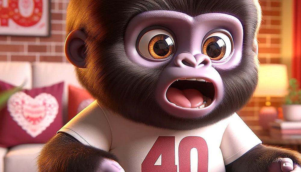 In een gezellige woonkamer zit Gorilla Lady No. 40 voor een open doos chocolaatjes die bij Valentijnsdag lijken te horen. Haar ogen zijn wijd opengesperd, bijna alsof ze de zoete verleiding nauwelijks kan weerstaan. Het gezellige interieur, versierd met hartvormige ballonnen en romantische ornamenten, biedt een liefdevolle setting voor deze speciale dag. De scène speelt charmant in op het thema van zelfliefde en het plezier van alleen zijn terwijl je je eigen behoeften viert.