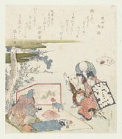 Vier kinderen kijken naar een speelgoedverkoper, die op de grond zit en zijn waren op een rieten mat heeft uitgestald. Hij wappert zijn waaier om een papieren leeuw te laten bewegen. De schelp waar de titel naar verwijst, is afgebeeld in het waaiervormige cartouche. Met twee gedichten.
