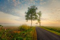 Zomaar een weg in het Drentse landschap, hier kun je dwalen en verdwalen op een mistige ochtend.
