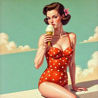 Dit kunstwerk vangt de essentie van tijdloos zomerplezier en mengt nostalgie met levendige energie. Als kunstenaar wilde ik de charme van de pin-upkunst uit het midden van de 20e eeuw oproepen, waarbij vrouwelijkheid en vrije tijd worden gevierd in een speelse, retro-esthetiek. De centrale figuur - een zelfverzekerde, zorgeloze vrouw in…