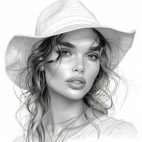 Verlies jezelf in de betoverende schoonheid van Zomer Charme: Vrouw met Grote Hoed in Lijnkunst. Deze compositie vangt de frontale blik van een vrouw, wiens delicate en serene uitdrukking harmonieert met de vloeiende lijnen van haar hoed en haar golvende lokken. De nauwkeurig getekende lijnen geven zowel de textuur als de beweging van haar golvende haar en de stof van de hoed weer.