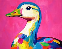 Zomer Eend Kleur - Op dit dieren schilderij zie je een kleurrijke eend met een levendige uitstraling, tegen een felle roze achtergrond, die de vrolijke en moderne stijl van het kunstwerk benadrukt.