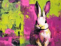 Details: dieren schilderij, schilderij haas, modern kunst, abstract schilderij, roze, groen, geel, vrolijk, hedendaags, kleuren
