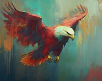 Zomer Vliegende Arend | Arend in Helder Kleurenspel - In dit schilderij zie je een prachtige arend met een opvallend rood en wit verenkleed, die majestueus door de lucht vliegt tegen een achtergrond van heldere kleuren, wat het een dynamische en moderne uitstraling geeft.