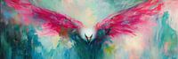 Zomer Vogel met Vleugels | Abstracte Vogel met Roze Vleugels - Op dit schilderij zie je een indrukwekkende vogel met grote, felroze vleugels, tegen een achtergrond van zachte, blauwe en groene tinten, wat een moderne en abstracte sfeer geeft aan de kunst.
