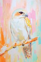 Zomer Vogel - Op dit schilderij van een vogel zie je een mooie, kleurrijke vogel met opvallende kenmerken die op een tak zit, omringd door zachte pastelkleuren die de vrolijke sfeer van de zomer benadrukken.