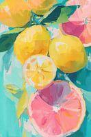 Een fris kunstwerk dat citrusvruchten tot leven brengt in een moderne, expressieve stijl. De compositie toont sappige gele citroenen en roze grapefruits tegen een turquoise achtergrond, uitgevoerd in losse penseelstreken. De kleuren spatten van het doek af en creëren een zomerse, mediterrane sfeer die direct vrolijk stemt.