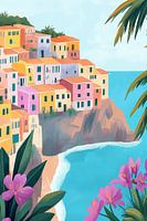 Een schilderachtige interpretatie van een mediterraan kustdorpje, waar kleurrijke huizen in warme pasteltinten tegen een steile klif zijn gebouwd. Het turquoise water van de zee contrasteert prachtig met de terracotta daken, terwijl roze hibiscusbloemen en palmbladeren het beeld omlijsten, wat resulteert in een dromerige, zomerse sfeer die doet denken aan de Italiaanse kust.