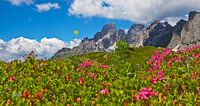 Bloeiende alpenrozen tegen de achtergrond van de Bischofsmütze op het Rinderfeld in Filzmoos