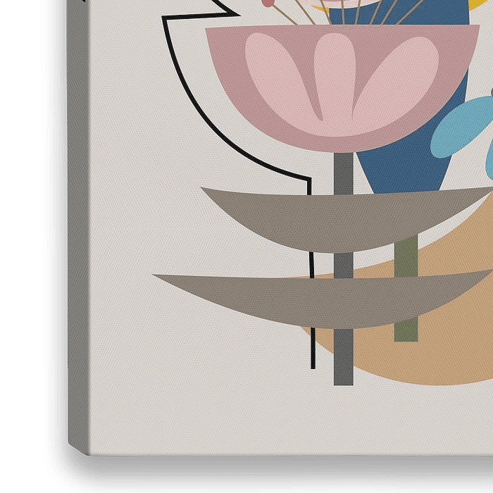 Trendy kleuren, vormen en lijnen krijgen aandacht in deze tijd. U vindt ze terug in dit eigentijdse kunstwerk met geabstraheerde bloemen en een gouden zon