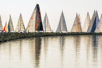 Start van een zeilregatta vanuit de haven van Stavoren in Friesland met het strekdammetje op de voorgrond als scheidslijn.