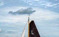 Bovenkant van de mast van een skutsje met een pastelgetinte wolkenlucht