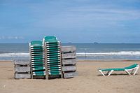 Dit strakke, grafische kustbeeld vangt de rustige momenten op het strand van Scheveningen. De compositie wordt gedomineerd door een stapel gestapelde, mintgroene strandstoelen en de houten kratten met genummerde compartimenten. Dit creëert een strakke, modulaire structuur tegen de organische chaos van het zand en de zee. Rechts staat één eenzame stoel, uitnodigend en sereen.