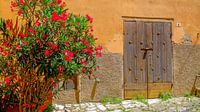 Mij viel deze mooie oude deur met stervormige ornamenten op, gelukkig stond er vlakbij de deur deze bloeiende struik.