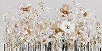 Weelderige bloemenzee waarin zachte tinten beige, crème en wit samenkomen in een elegante compositie. De bloemen zijn groot en expressief uitgewerkt, met brede penseelstreken die hun bloemblaadjes een tastbare textuur geven. Daartussen slingeren fijne takjes met kleine blaadjes en knopjes, die luchtigheid en beweging toevoegen aan het geheel.