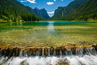 Een kleine waterval leidt de kijker naar het Toblach-meer op een zomeravond. De majestueuze bergen van de Dolomieten torenen boven het meer uit op een mooie zomerdag.