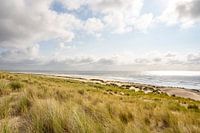 Zomer in de duinen aan het Noordzeestrand met wolken die over de zee drijven in de blauwe lucht op de achtergrond.