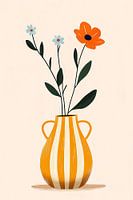 Een minimalistisch kunstwerk dat warmte en eenvoud uitstraalt door een gestreepte oranje vaas met twee handvaten, gevuld met een bescheiden boeket van lichtblauwe en oranje bloemen tegen een zachte beige achtergrond. De illustratie combineert moderne vormgeving met een vleugje retro-design, wat resulteert in een tijdloos en sereen beeld.