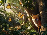Het is zomer in het bos. Vlinders dansen in het zonlicht. Een vos houdt ze in de gaten. Speciaal geschikt voor kinderen. De afbeelding is gemaakt met behulp van kunstmatige intelligentie.