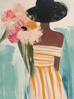 Zomer in je bol, kleurrijk portret van een vrouw met grote hoed en bloemen, vanaf haar rug gezien. In roze, geel, blauw, bruin en zwart. Een echte blikvanger voor je interieur!