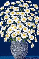 Een uitbundige bos margrieten vult het beeldvlak tot aan de randen, alsof de bloemen geen ruimte meer overlaten voor stilte. Witte bloemblaadjes waaieren speels rondom zonnig gele harten, die als kleine lichtbronnen oplichten tegen een diepblauwe achtergrond. De kleurcontrasten zijn krachtig en helder: het intens blauw versterkt het…