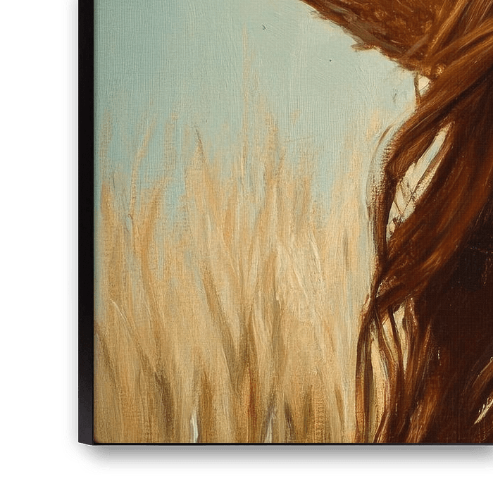 In het zachte licht van een zomerse dag straalt een jonge vrouw sereniteit uit. Haar gouden haren stromen over haar schouders, terwijl haar brede strohoed zachtjes wiegt in de wind. Met gesloten ogen geniet ze van de warmte van de zon en de vrijheid om haar heen. Een gevoel van vrede en gratie doordringt het tafereel, harmonieus ingebed in een gouden veld.