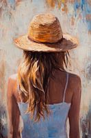 Een gouden zomerbries blaast zachtjes door het lange, glanzende haar, dat glinstert in het licht. De breedgerande strooien hoed biedt een vleugje bescherming, terwijl daarachter een zacht, lichtgekleurd oppervlak zinspeelt op zorgeloze dagen aan zee. Een gevoel van vrijheid en zomerse lichtheid omringt deze silhouetfiguur.