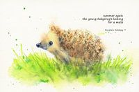 Nieuwsgierig egeltje in de wei is een aquarel schilderij in landschap formaat met de hand geschilderd door de kunstenaar Karen Kaspar.