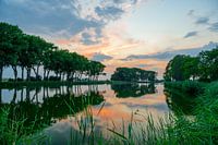 Zomerse zonsondergang in de IJsseldelta bij Kampen in Nederland. De zon gaat onder boven het Noorddiep bij Kampereiland.