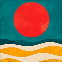 Een felrode bol van de zon nestelt zich tegen de heldere, turquoise gekleurde lucht, terwijl zachte, gebogen golven in warme tinten geel en zand de onderste helft van de foto domineren. Dit harmonieuze kleurenspel belichaamt een gevoel van rust en dromerige uitgestrektheid dat uitnodigt om te blijven hangen.