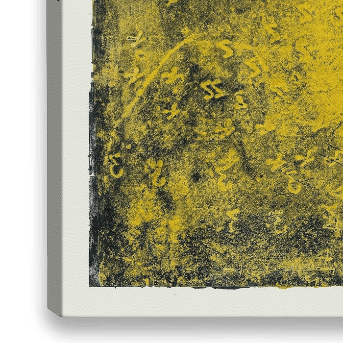 Deze ets toont een abstract veld van kleur en tekens: kleine markeringen die lijken op letters, cijfers en fragmenten van een onleesbare code. Ze zweven door een achtergrond van okergeel en diep zwart, alsof ze deel uitmaken van een vergeten alfabet.