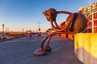 De verlaten boulevard in Scheveningen ter hoogte van het museum Beelden aan Zee kleurt rood tijdens de zonsondergang van een vroeg Zomerse dag in de Lente van 2019. Links op de achtergrond is de pier met het reuzenrad zichtbaar.