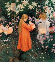 Een betoverend schilderij in een weelderige tuin waar twee jonge vrouwen in lange jurken lantaarns ophangen tussen bloeiende witte lelies en roze rozen. De warme oranje en witte tinten van de papieren lantaarns contrasteren prachtig met de donkere achtergrond van het gebladerte, wat zorgt voor een dromerige, romantische sfeer. Een volwassen interpretatie op Carnation, Lily, Lily, Rose van John Singer Sargent.