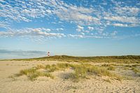 De warme zonnestralen aan het begin van de avond schijnen op de duinen met het duingras en de vuurtoren van List-Ost in de bocht van Sylt.
