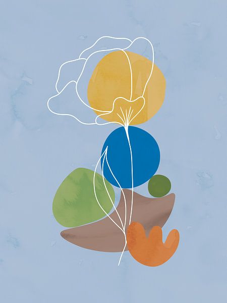 Abstracte landschapsillustratie van een bloem en zes organische vormen, die staan voor de aarde, planten, bloemen, de lucht en de zon.