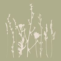 Collage van tekeningen van zomerbloemen, planten, kruiden, grassen.
