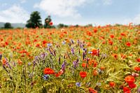 Uitzicht over een gerstveld waarin ontelbare knalrode klaprozen groeien. Op de voorgrond bloesems in de kleuren blauw en paars. Blauwe lucht met weinig wolken, zomerse sfeer. Voorgrond in focusgebied, achtergrond onscherp - Locatie: Duitsland, Saksen