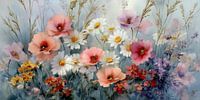 De compositie toont een harmonieuze mix van verschillende wilde bloemen verspreid over het hele beeldoppervlak. Witte margrieten met hun heldergele hart zetten frisse accenten tussen de kleurrijke klaprozen, terwijl paarse bloemen op de achtergrond een romantische diepte creëren. Gouden grassen weven op natuurlijke wijze door het tafereel en geven het een organische structuur.