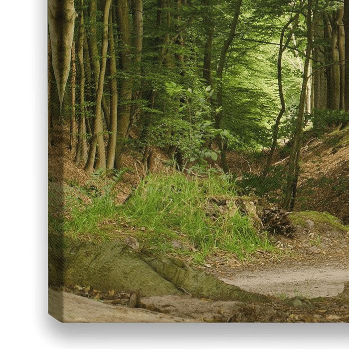 Een zomers en toch enigszins enigszins mysterieus bostafereel, met en bocht in een zandweg, rijen beuken en een droge greppel, in de buurt van Dalfsen, Overijssel.