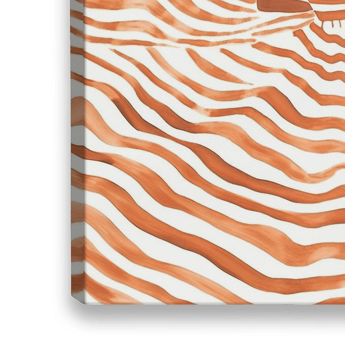 Een gestileerde vrouwelijke figuur gehuld in een elegante zomerjurk, gezien vanaf de rug, met een weids uitlopende rok die naadloos overvloeit in de omgeving. Het gebruik van zachte aardetinten en de golvende lijnen van de jurk suggereren een zachte bries en een gevoel van vloeiende beweging, alsof de jurk en de lucht één zijn. Er is een speels contrast tussen de strakke strepen van de jurk en de organische vorm van de hoed, wat een interessante dynamiek creëert. De anonimiteit van de figuur nodigt uit tot projectie van de kijker, waardoor een universeel beeld ontstaat dat de vorm overstijgt.