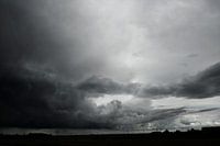Donkere wolken pakken zich dramatisch samen boven het Deense landschap. Zwart-wit fotografie.