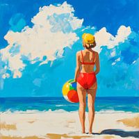 Felle zon baadt het landschap in een warm licht terwijl de zachte golven van de oceaan op het strand kabbelen. Een jonge vrouw in een felrode zwembroek, met een vrolijke, kleurrijke bal in haar hand, staart dromerig in de verte. Haar gele pet straalt levensvreugde uit en harmonieert perfect met de helderblauwe lucht.