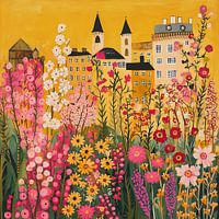 In de verte ligt het lieflijke dorpje Petit Bloemetjes, badend in een diepe gele gloed die het hele tafereel in warmte hult. De huizen, charmant en vrolijk, zijn geschilderd in tinten zachtgeel en zalmroze. Ze hebben witte kozijnen en kleine, vierkante raampjes die als glimlachende ogen naar het bloemenveld kijken. Alles lijkt stil te staan in een moment van zomerstilte en harmonie.
