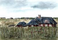 Deze aquarel toont een typisch rietgedekt zomerhuis aan de Noordzeekust van Denemarken.