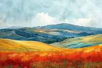 Dit levendige kunstwerk vertaalt de essentie van een zomerse dag op het platteland in een explosie van kleur en textuur. Het schilderij toont een golvend landschap bezaaid met vurige rode bloemen op de voorgrond, met zacht rollende heuvels die verderop in diverse tinten blauw en groen overgaan. De subtiele hints van geel verlevendigen…