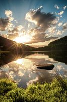Geweldige weerspiegeling in het water in een meer, mooie lucht met wolken en zonsondergang, midden in de natuur en het bos