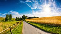 Zomerlandschap met een landweggetje naast een graanveld in de felle zon